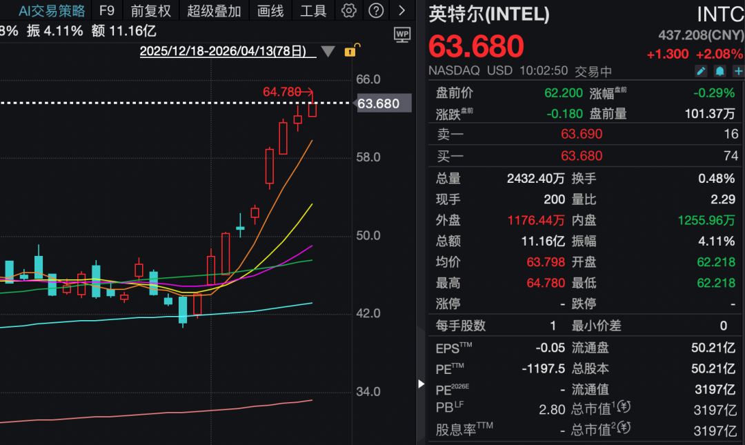 个股方面,英伟达持仓概念股盘初集体上扬,CoreWeave涨近6%,诺基亚涨超4%。英特尔涨约2%,其在最近8个交易日内大涨,市值累计增加超1000亿美元。消息面上,英特尔4月初宣布将斥资142亿美元从阿波罗全球管理公司手中回购其爱尔兰工厂的一半股权,这一举动被视为公司转型取得进展的信号。
