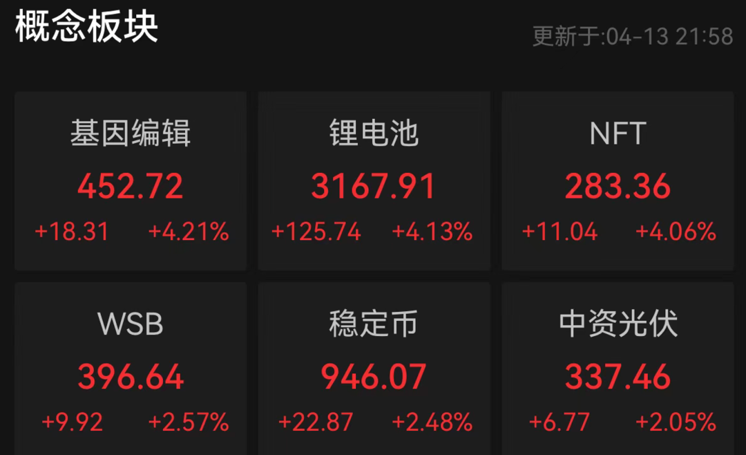 基因编辑、锂电池、稳定币、中资光伏等板块领涨。