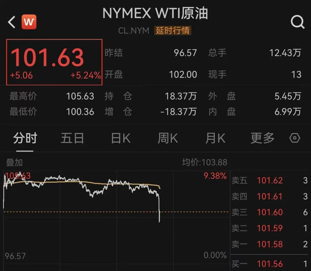 商品市场方面,原油价格在全天保持强势后突然直线跳水。截至发稿,WTI原油报101.63美元/桶,涨幅收窄至5.24%,此前涨幅一度超过9%。布伦特原油价格一度跌破100美元关口。